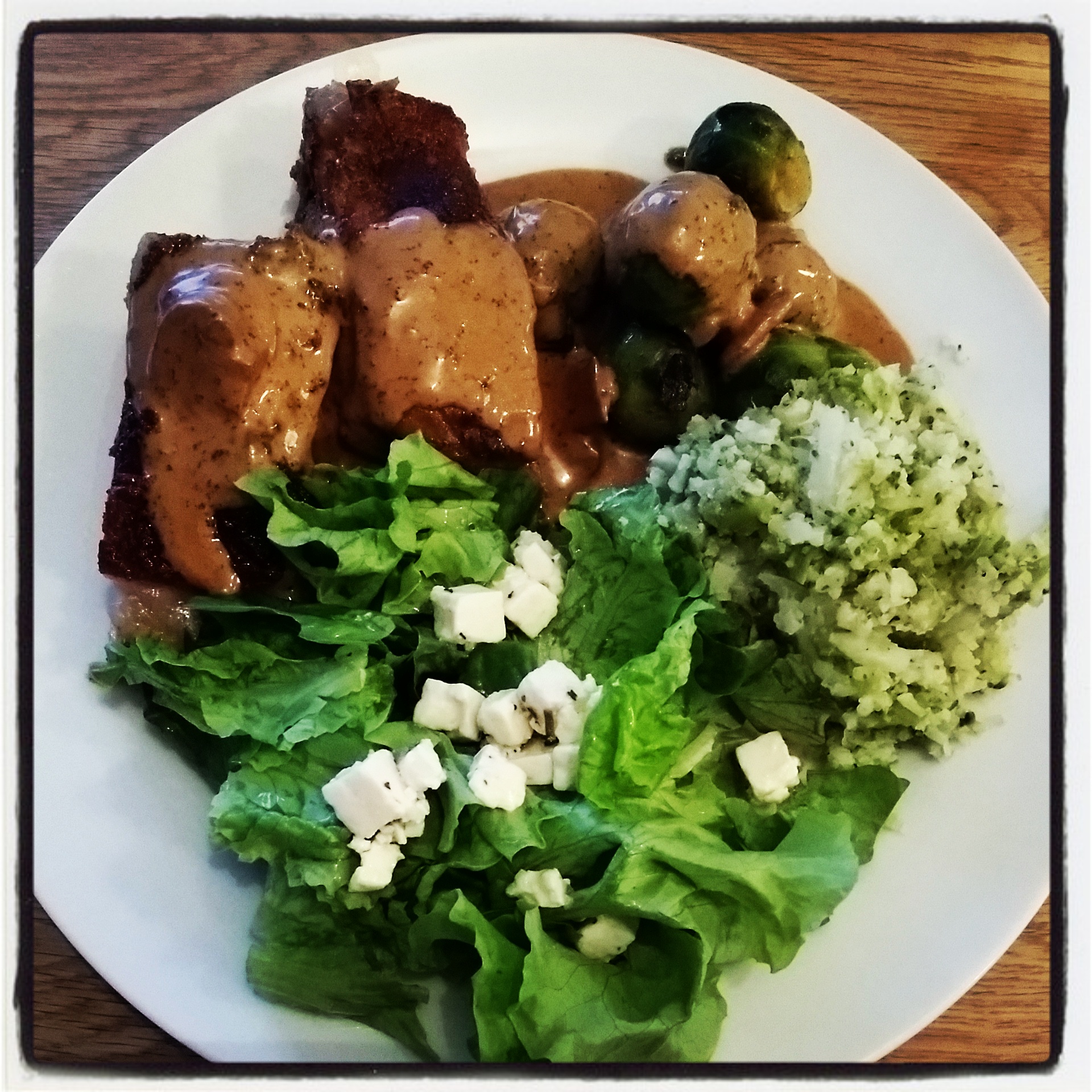 Lambahryggur (kryddaður með season all og húnagulli), smjörsteikt rósakál, brokkolí og blómkálsstappa, salat með fetaosti