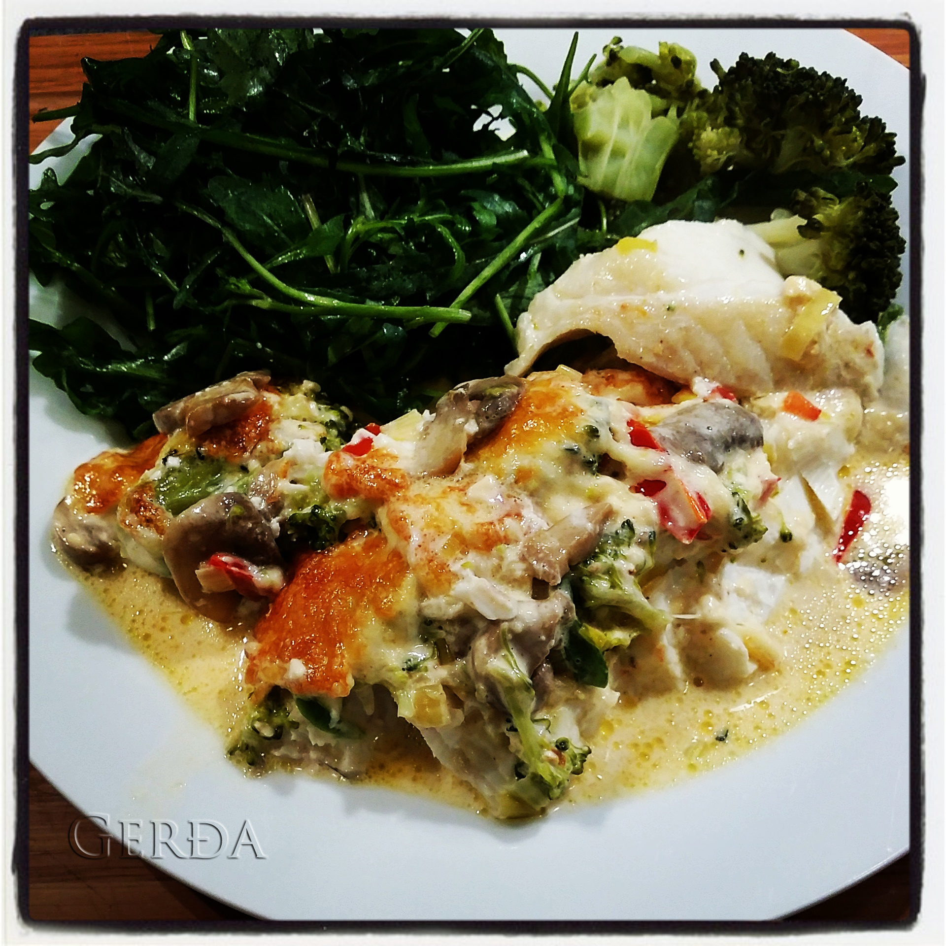 (Fiskur, sveppir, paprika, blaðlaukur, brokkolí, villisveppa og paprikuostar og rjómi)