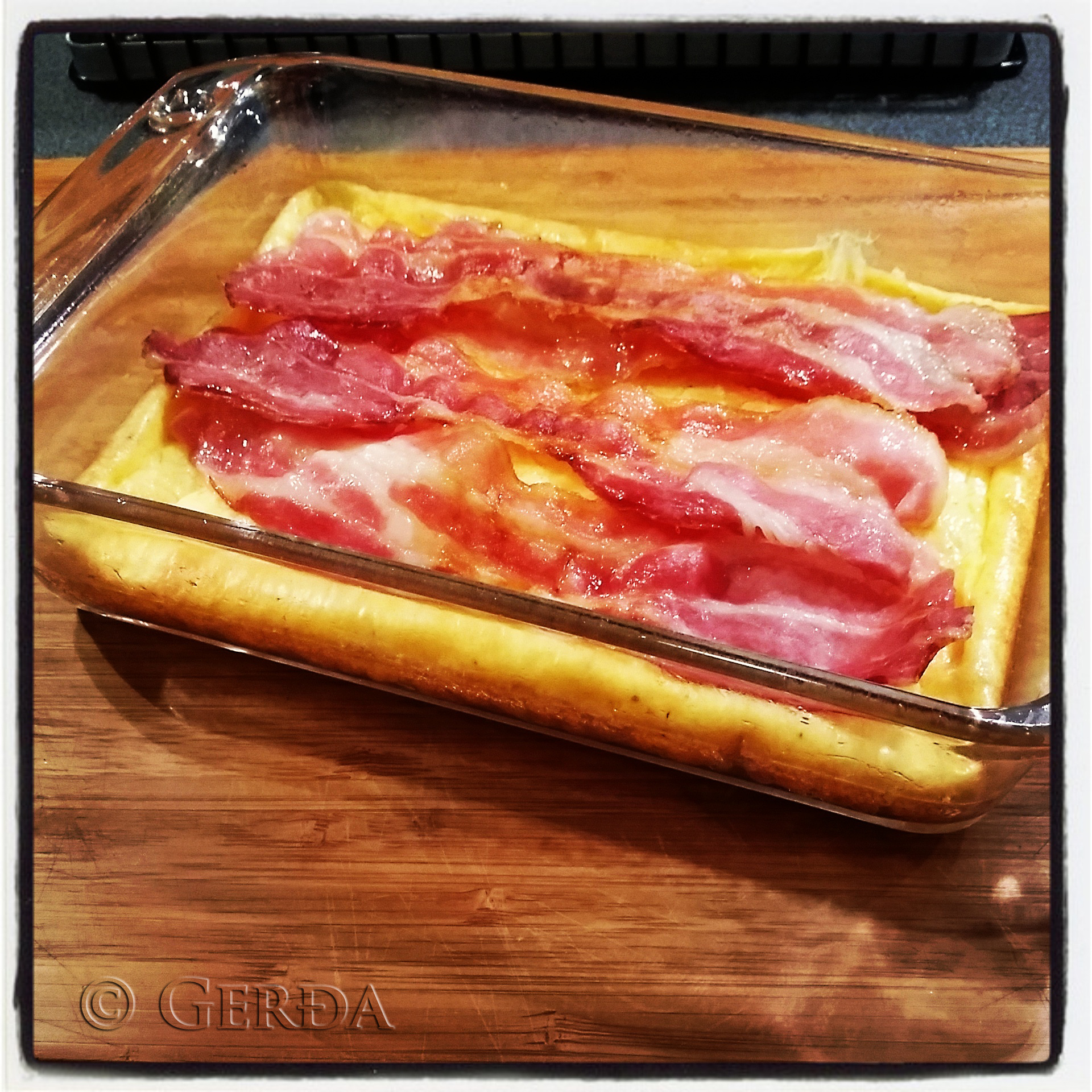 Setti helmingin af hrærunni á pönnuna, setti áleggið ofan á og svo restina af blöndunni.