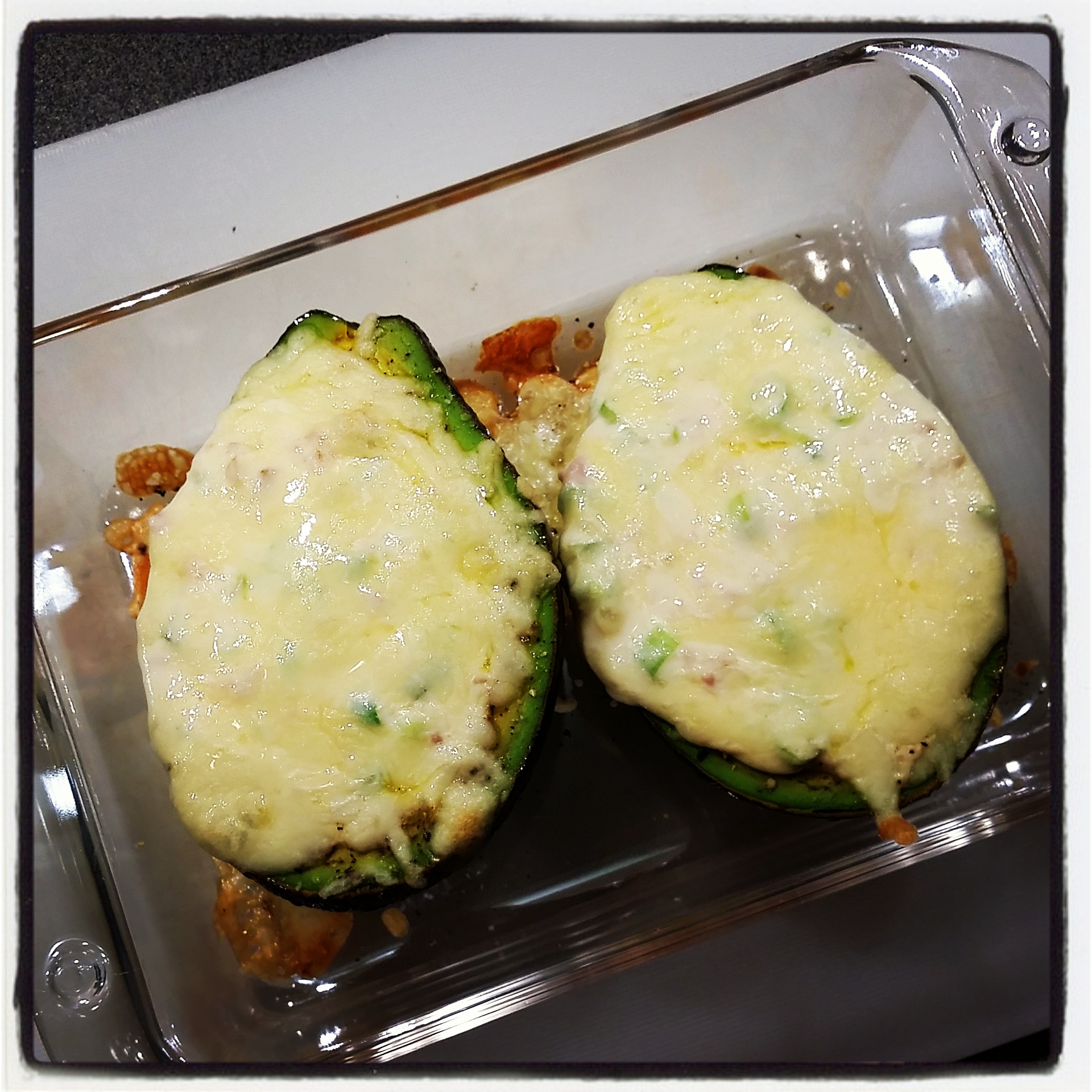 Ég skar avocadoið í sundor og fjarlægði steininn. Hann var stór þannig að ég þurfti ekki að skafa í viðbót til að gera stærri holu. Skar örþunna flís neðst af þeirri hlið sem snýr niður á myndinni svo það myndi ekki hallast.