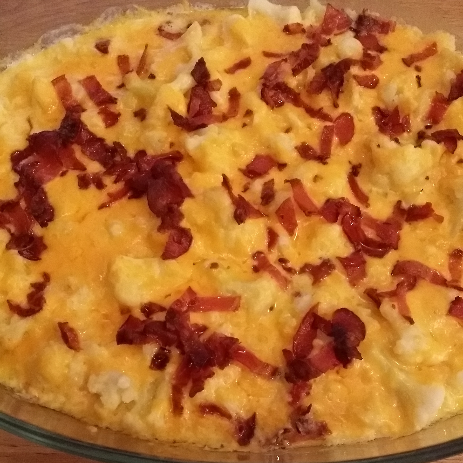 Setja í eldfast mót, hella ostasósu yfir, setja svo um 150 gr af cheddar yfir það, skera niður 8 steiktar beikonsneiðar og dreifa yfir.