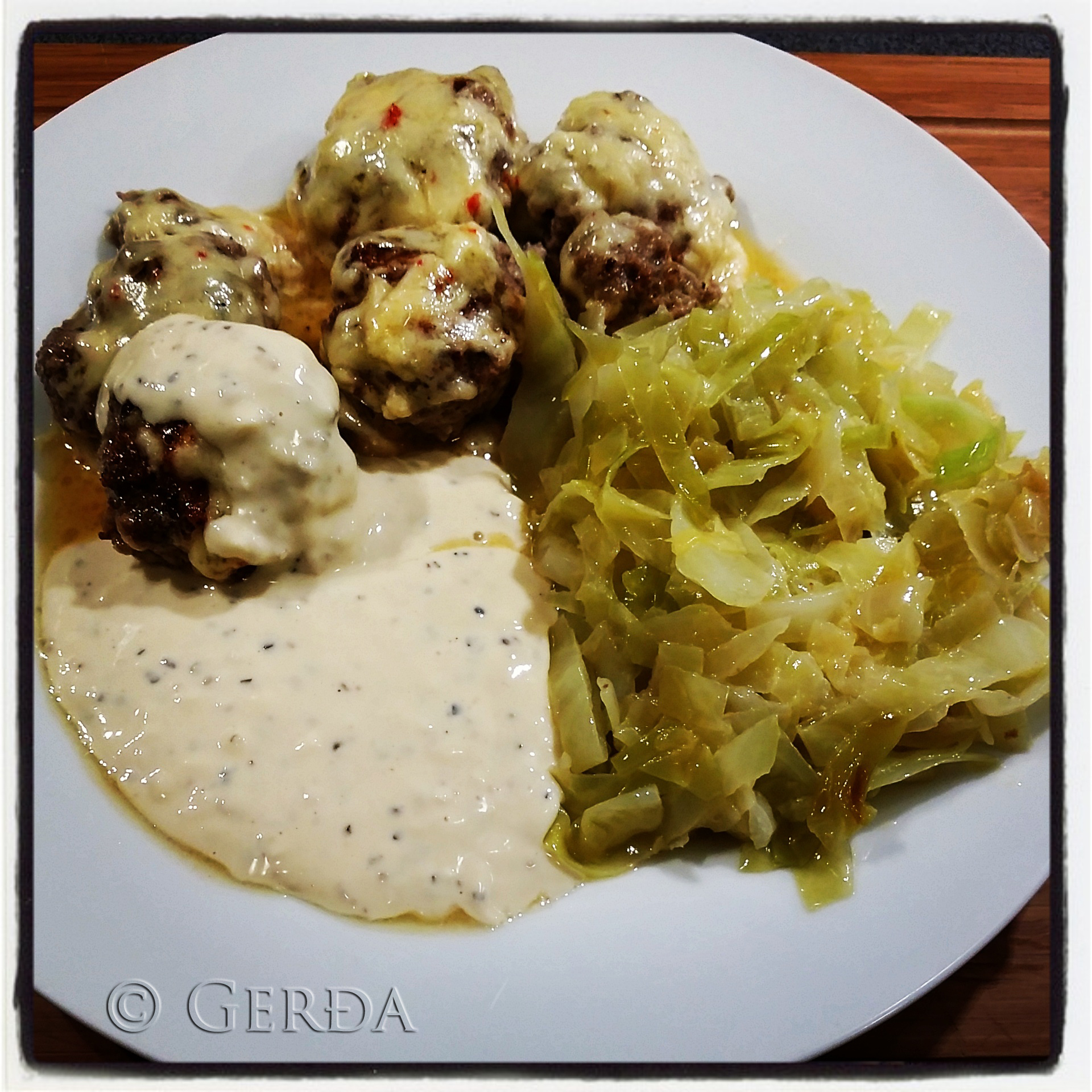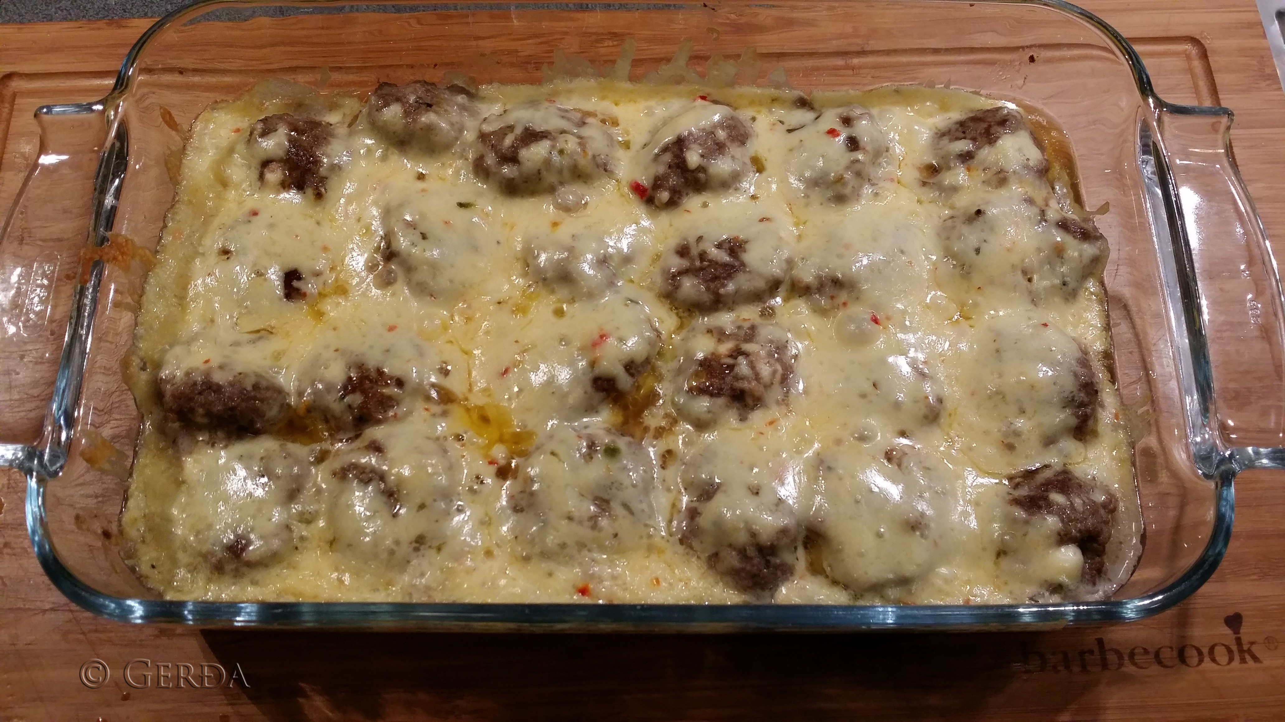 Sett í eldfast mót, ostinn yfir og inní 180°C ofn í 15 mín eða þar til bollurnar eru steiktar í gegn.