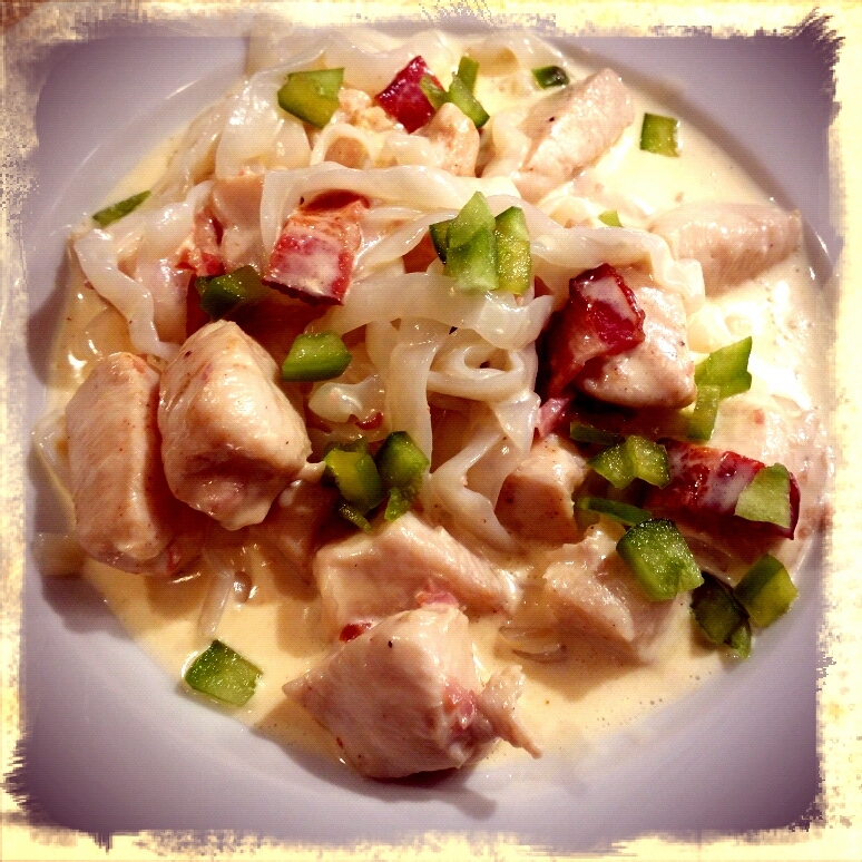 Ég steikti kjúklinginn í wok pönnu uppúr ólífuolíu og bræddi á meðan heila dós af smurostinum á móti slatta af rjóma í potti…..mældi það ekki, en sósan varð frekar þunn.