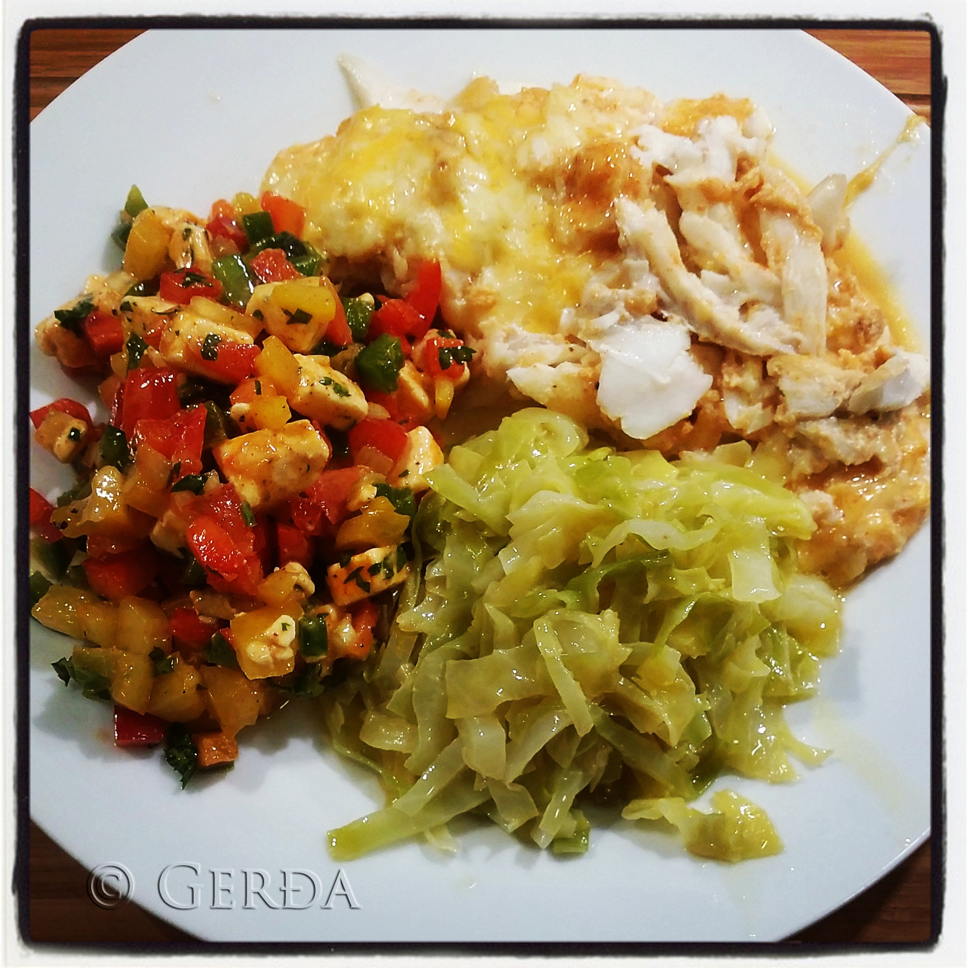 Með honum bar ég fram paprikusalsa og smjörsteikt hvítkál.