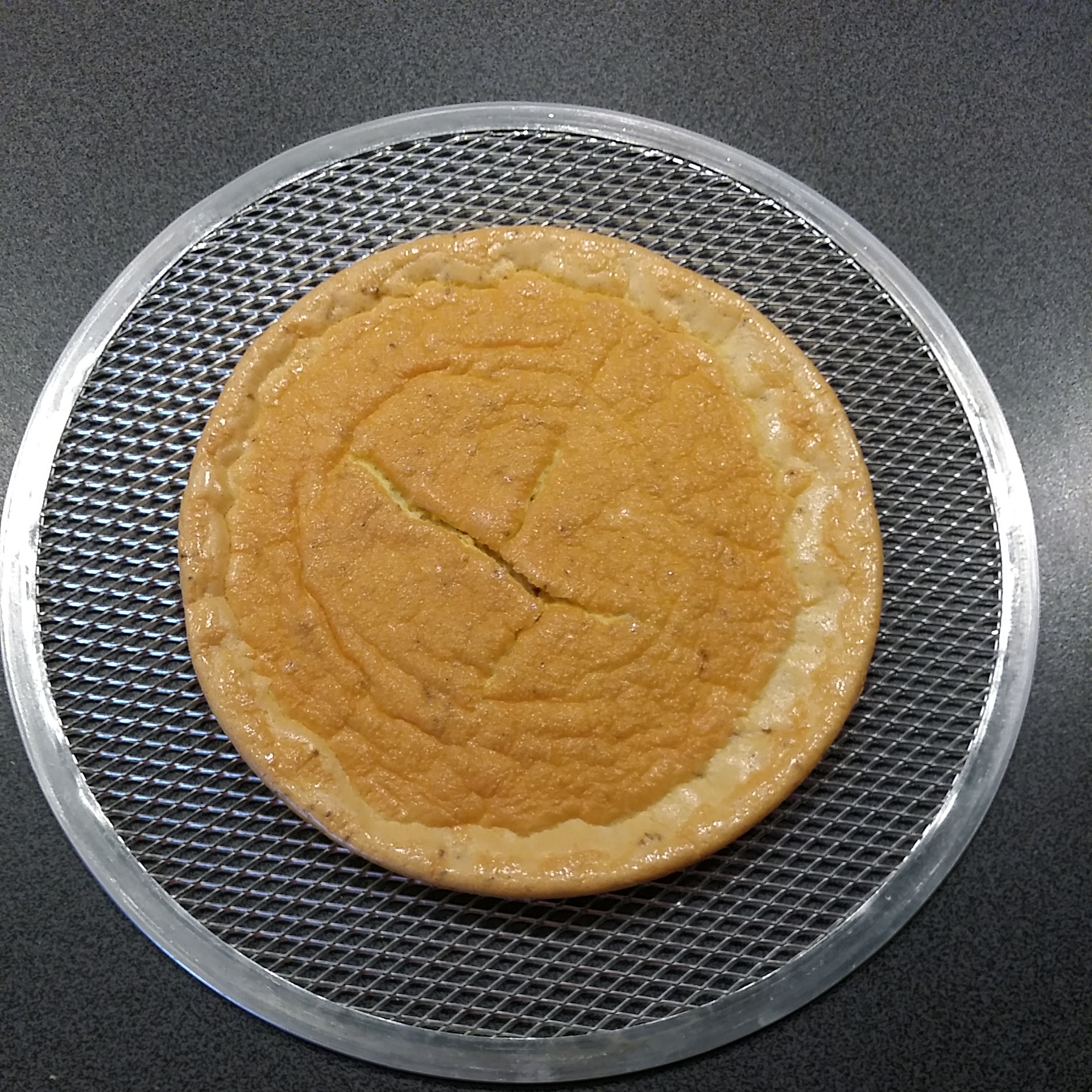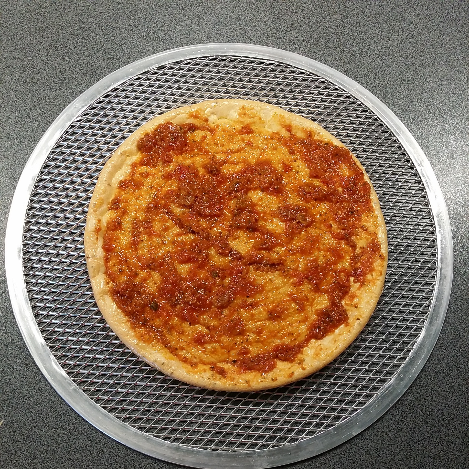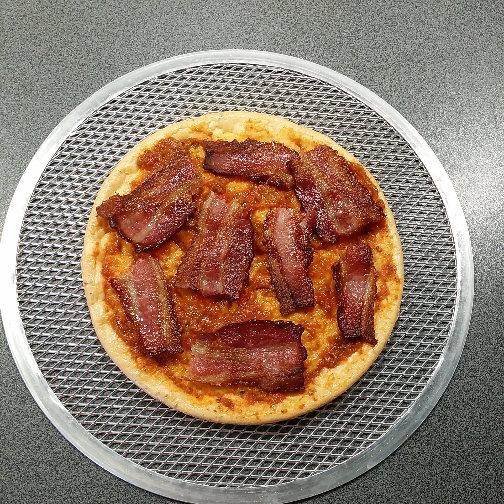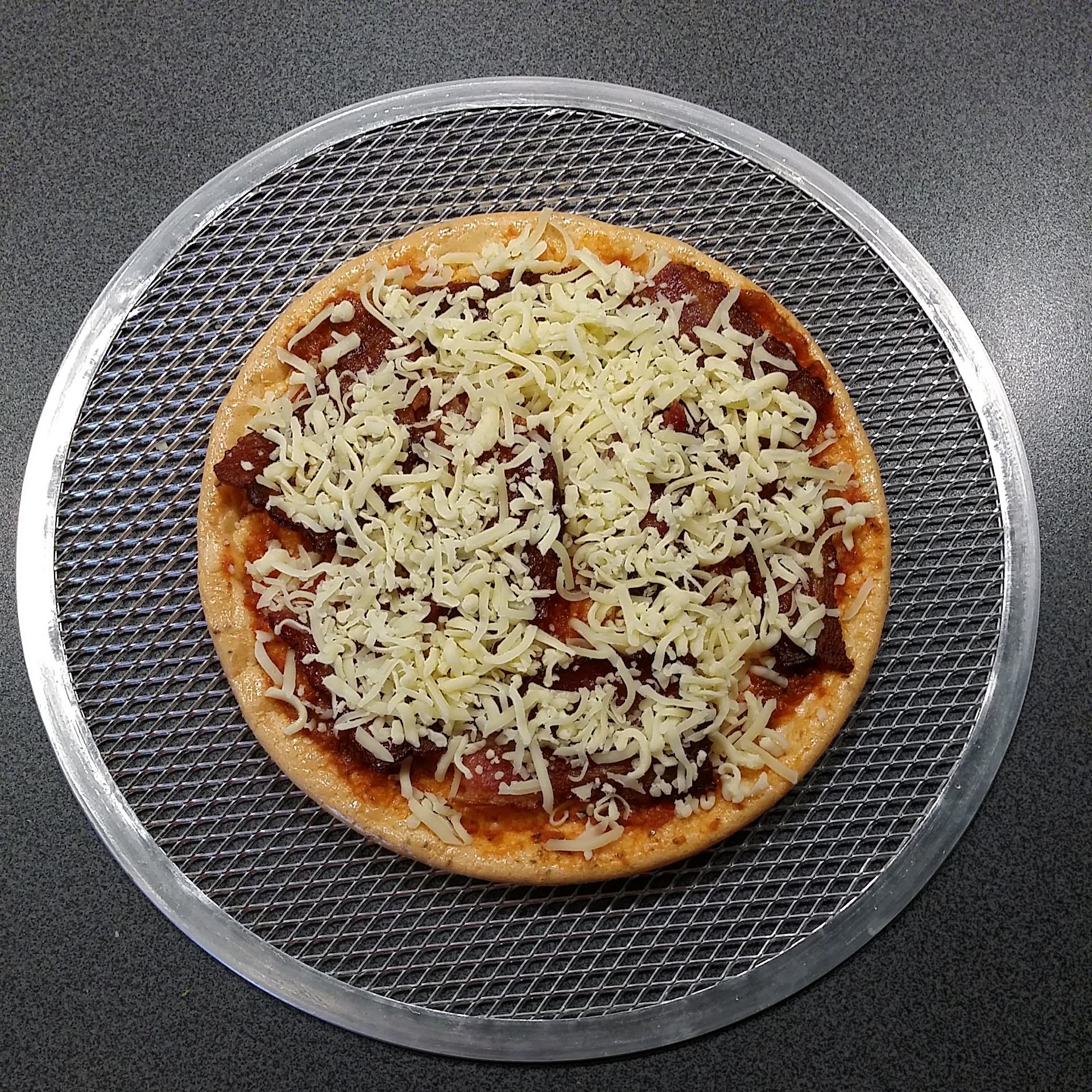 Ég hrærði öllu vel saman með handþeytara, setti í teflonmót (keypti þetta í Húsasmiðjunni á rétt rúman 500 kall) og bakaði við 200°C í 15 mínútur. Tók út, setti á pizzagrind (fæst í sænsku búðinni í IKEA, fyrir framan afgreiðslukassana) setti Sacla tómat- og hvítlaukspestó (ca 2 msk), 4 steiktar beikonsneiðar, og toppaði með rifnum gratínosti. Setti aftur inn í 8 mín.