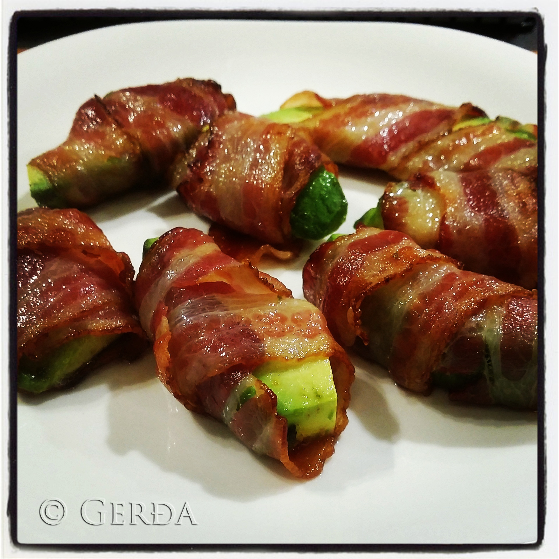 Tók það svo út og vafði 1 sneið um hvern bita……og aftur inn í 10 mín :)