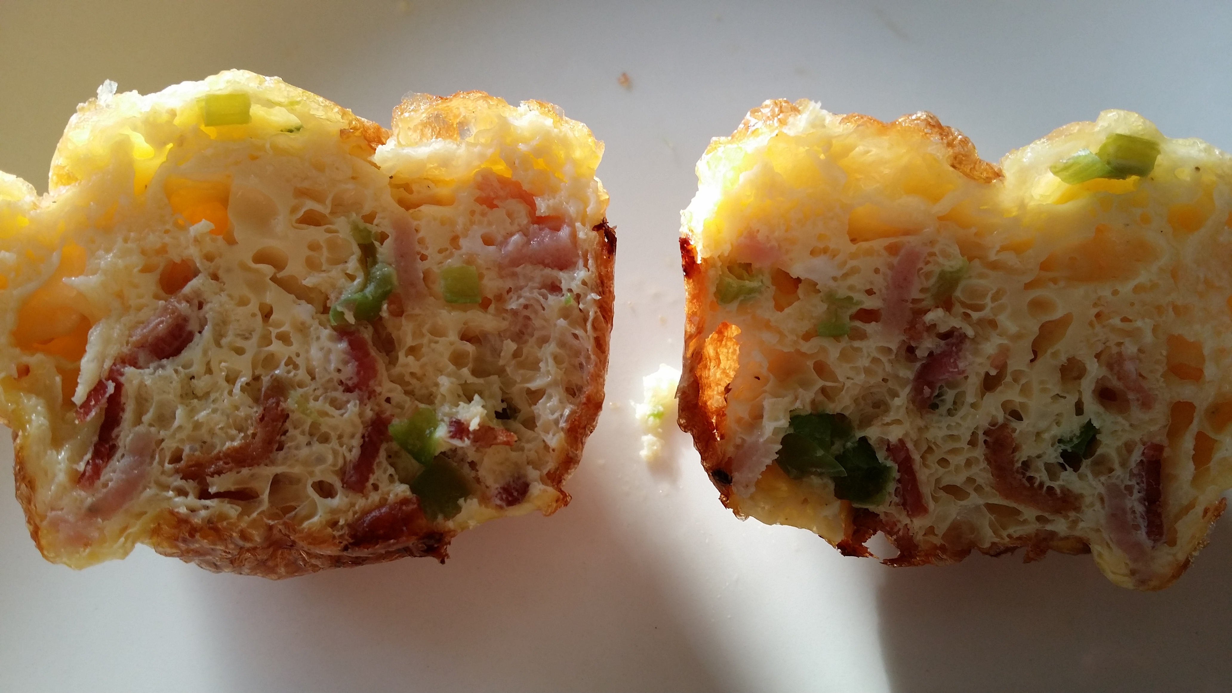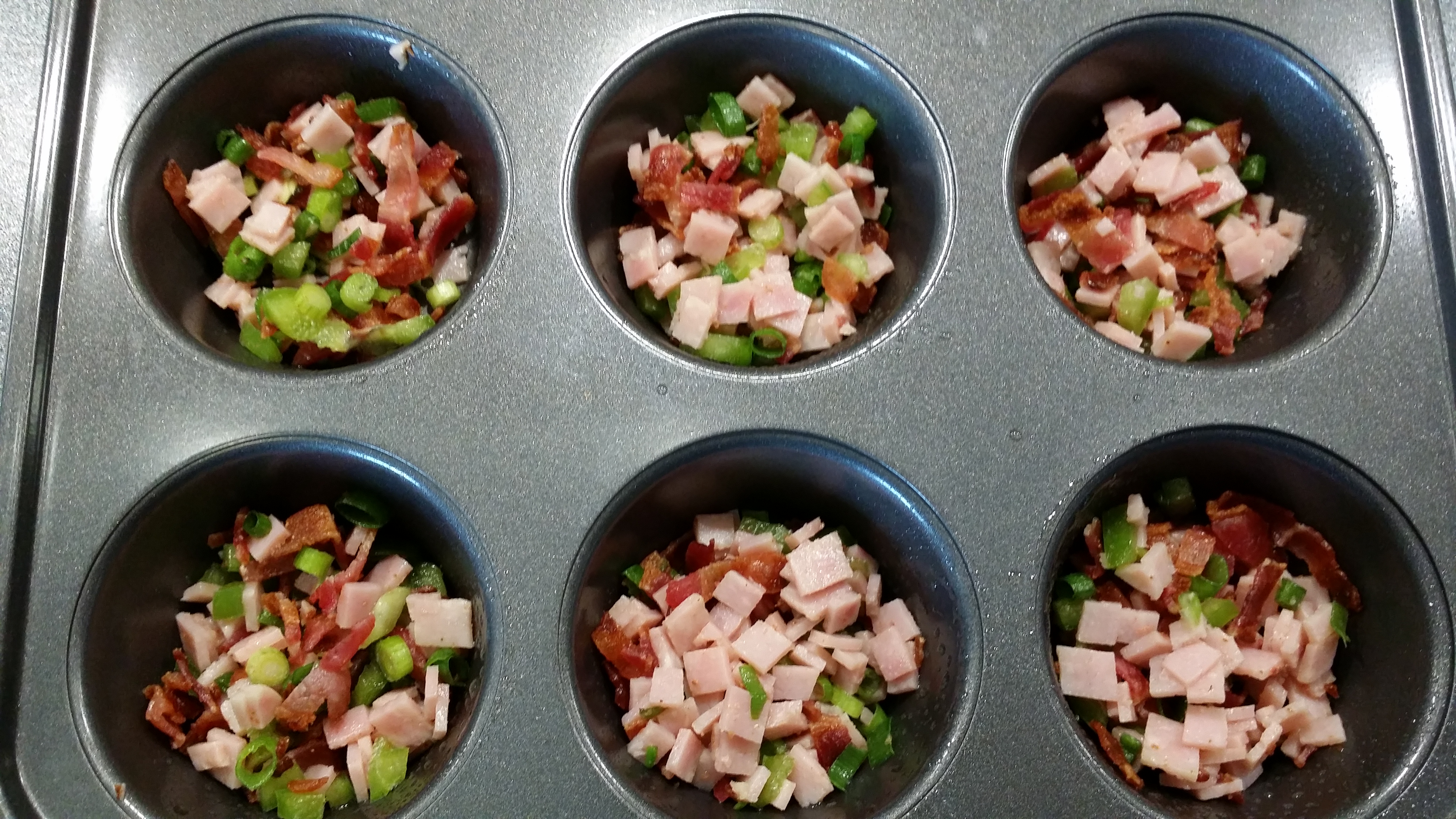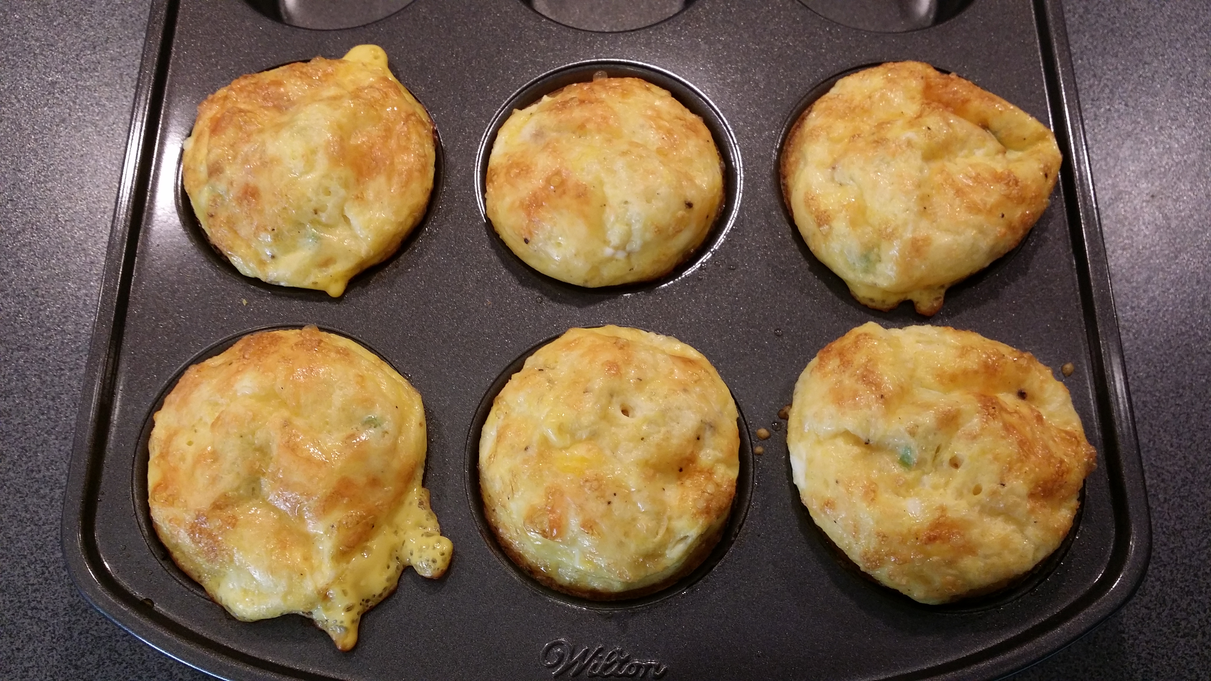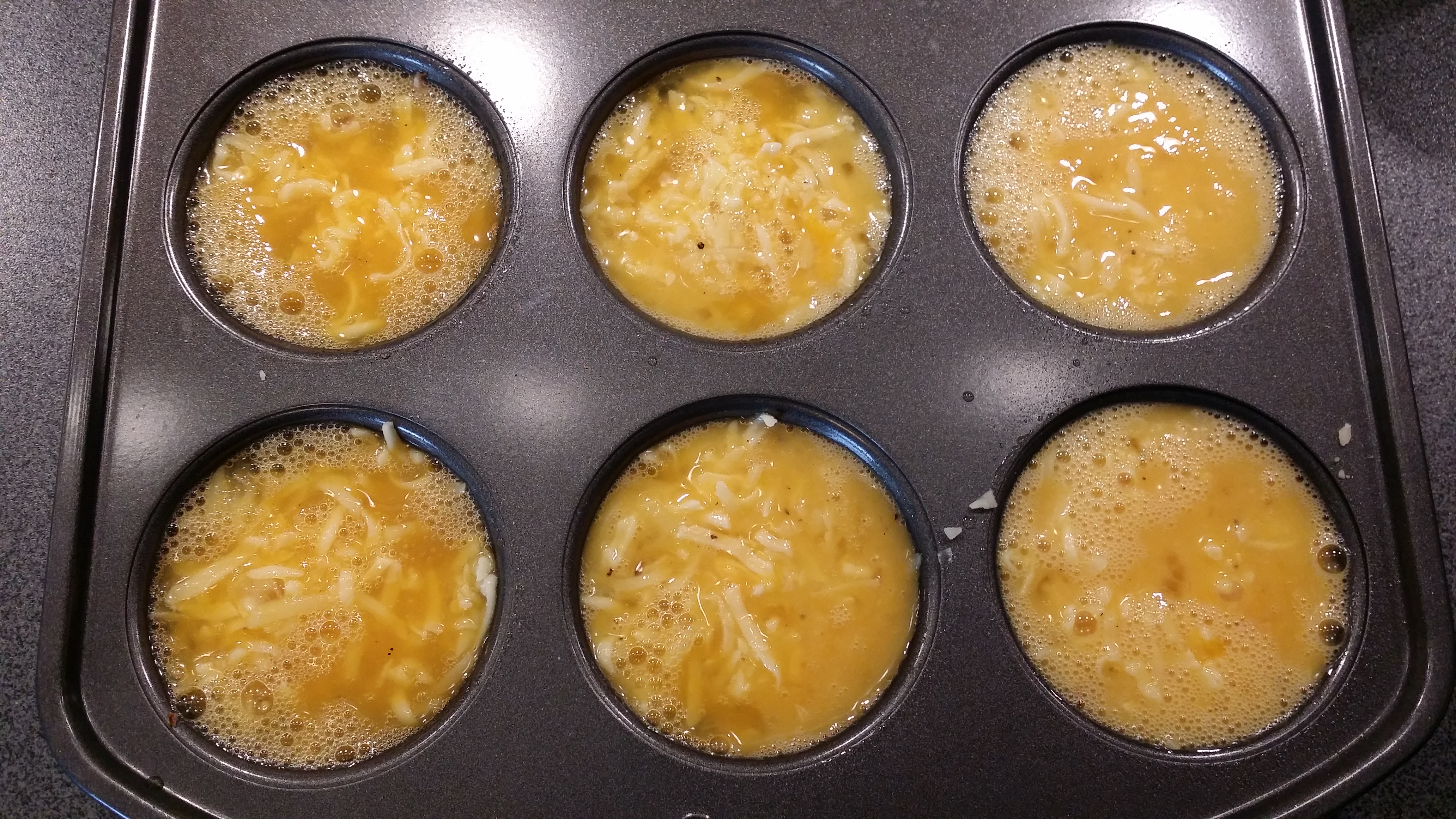 Ég spreyjaði formin með smá PAM, blandaði grunninum saman til að það myndi dreifast jafnt, setti ostinn ofan á og hellti svo hrærðum eggjum yfir allt…..skildi eftir smá pláss því þetta lyftist :)